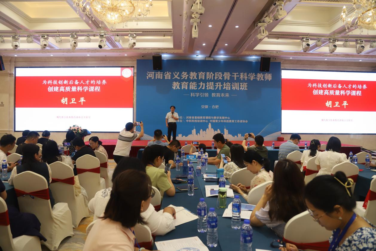 接下来陕西师范大学现代教学技术教育部重点实验室胡卫平教授的《为科技创新后备人才的培养创建高质量科学课程》、天津师范大学吴艳茹教授的《技术与思维的融合:谈创客型教师的培养》、国家自然博物馆科普教育部金淼老师的《社会资源助力科学教育——以博物馆+学校为例》、中科院合肥物质科学研究院固体物理研究所康升红博士《新型材料的研发及其应用》、北京师范大学魏锐教授《项目式学习——推动核心素养教育落地》、GreenpowerChina CEO张俊义老师的《科学教育工坊:工程科学实践》、中国青少年科技教育工作者协会范体宇处长《青少年科技教育重点活动与工作》、《中国科技教育》杂志编辑黄锦华博士的《科技论文写作》、安徽大学李雅筝博士的《利用生成式AI打造高效STEAM教育》、中国科学技术大学倪永强主任的《世界科技前沿与热点研究》、中科院合肥物质科学研究院等离子体物理研究所张素贞博士的《种下未来科学家的种子——科研方法论与中小学科学教育》、北师大附中张亚老师的《基于跨学科角度的科技教育活动的设计与实施》、北师大附属实验中学刚永运老师的《青少年科技创新课题研究实践流程与方法技能》、浙江省温州科技高中谢作如老师的《人工智能支持下的中小学科创教育实践》等一系列专题讲座,集院士、科学家、全国十佳科技辅导员于一堂,从不同层面,多维度视角,与河南的科学教育教师代表们面对面,进行了为期一周的交流与探讨,既有科学前沿与研究,又有科创转化和实践,使与会老师们专享了一场科学、科技和科教的饕餮盛宴。